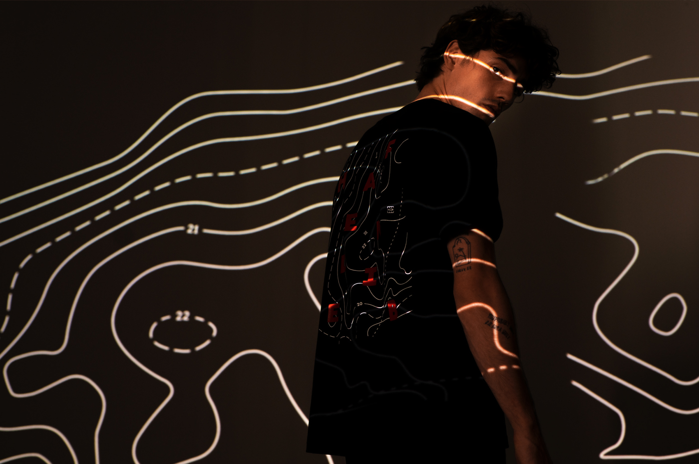 Für das Shooting wurden diese Motive in grafisch abstrahierter Form mit Beamern auf die Models projiziert, um die Wirkung der Kollektion zu intensivieren.